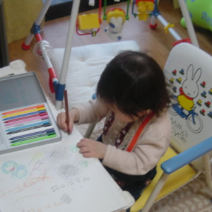Miffyのテーブルつきのイスを購入。他のキャラのは座ってもすぐ立ち上がってMiffyのイスに座るくらいのお気に入りだったよ。帰るなりすぐに座ってクーピーでお絵かき帳に芸術は爆発ぅ〜。