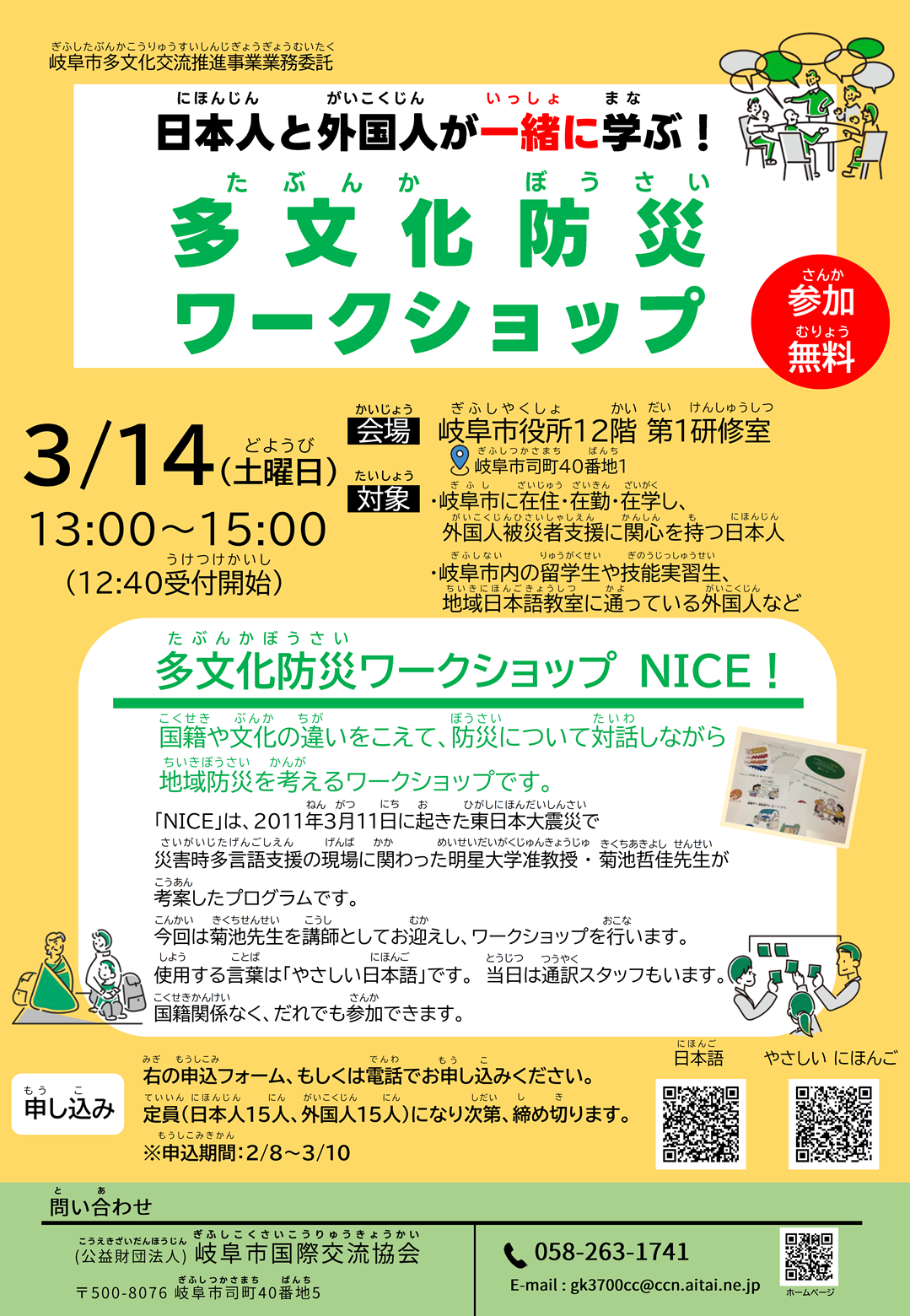 国籍や文化の違いをこえて、 防災について対話しながら地域防災を考えるワークショップです。 「NICE」は、東日本大震災で災害時多言語支援の現場に関わった 明星大学准教授・菊池哲佳先生が考案したプログラムです。 今回は菊池先生を講師としてお迎えし、直接ワークショップを行います。 使用する言葉は「やさしい日本語」です。 国籍関係なく、どなたでもご参加いただけます。