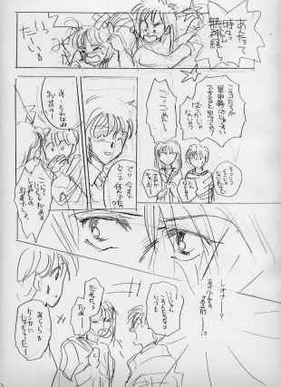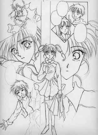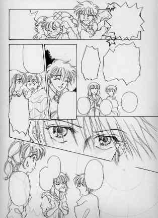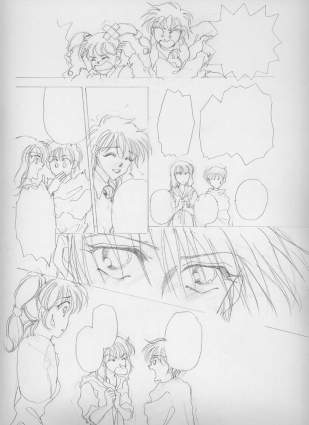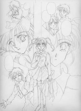 | Bさて、下書きです。ネーム見ながら商業用原稿用紙に描いていきます。ところで、私の「下書き」は人物のみ。とりあえず人物ペン入れ出来た後でもう一回「背景」の下書きに入ります。何度も何度も続くような終わりの見えない気分です。とほほ。(右へ) | C下書きはなるだけ余分な線を書かないように・・・それだけを頭にして書いてます。これがまたへたくそで何度も消してはやり直し・・・デッサンがすぐ取れない未熟者なので一枚につき一時間近くかかってしまいます。号泣。 こうして見ると、線一本に見えますが(何で?)実は「迷い線」いっぱい残ってます。 |