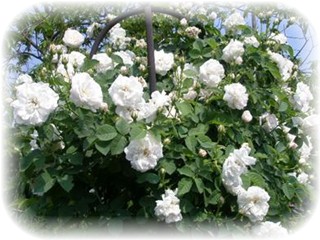 蕾はやや桃色を帯びています。 開花すると白色になりますが、中心はややクリーム色がかっています。 耐病性、耐寒性のある強健種で、日当たりの悪い場所でも育ちます。 枝が良く伸びますので、私はオベリスクに誘引しました。 香りの良い、一季咲きです。