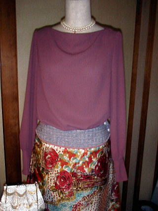 結婚式用に慌てて作りました。 生地はジョーゼット。前襟にドレープが入るタイプです。 この既製品のスカートに合わせたかったので 色をオフホワイトにしようかと迷ったけど、冒険してこっちに。 うーん、どっちがよかったかは未だに不明。