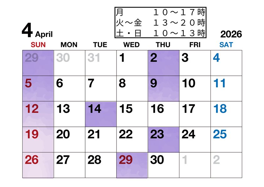 | 火~金曜日 13:00~20:00 ※19時以降は予約のみ受け付け |