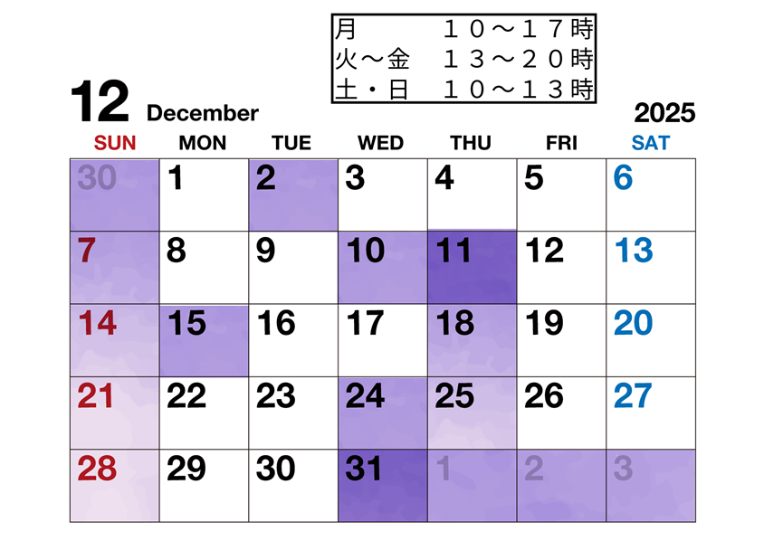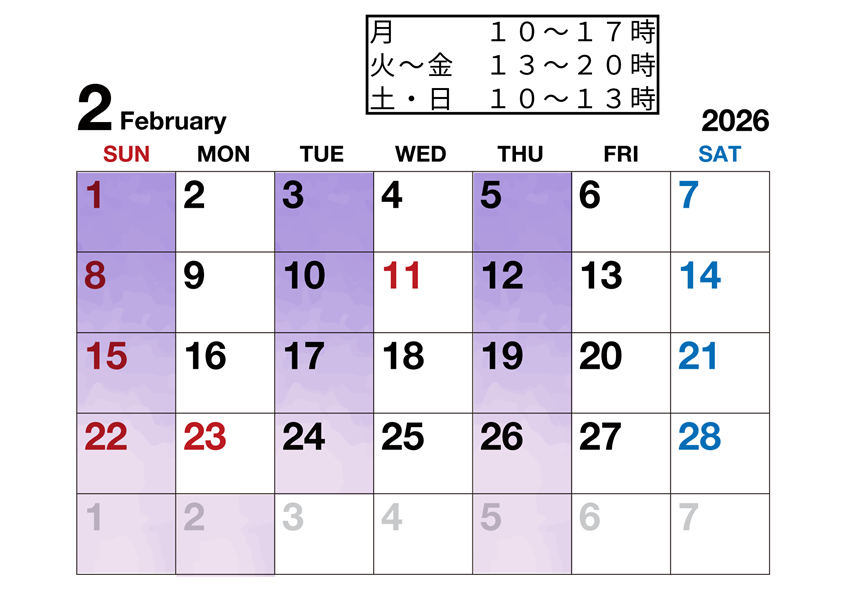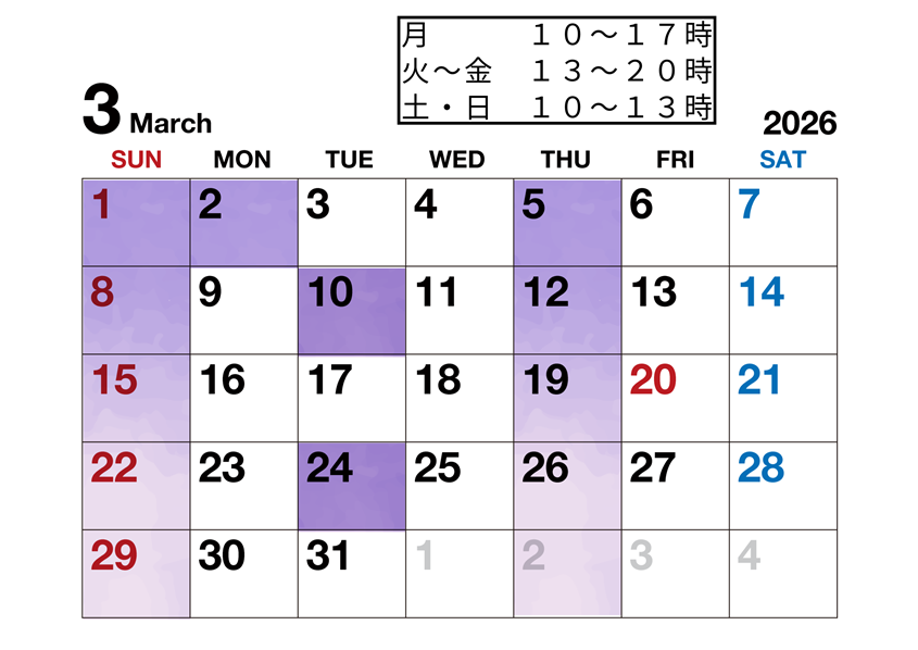 | 火~金曜日 13:00~20:00 ※19時以降は予約のみ受け付け |
