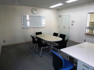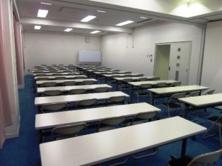 手前が会議室1、向こう側が会議室2です。普段は、パーテイションで区切られています。会議、打ち合わせ等にご利用いただけます。収容人数の目安は、会議室1が18名、会議室2が40名です。 |