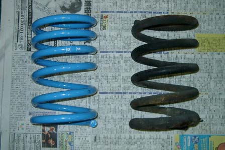 ウマ上げ状態からやっと大地に降りましたが、予想以上にリアが下がってしまいました。上の画像にポインタを重ねると交換前の画像になります。(クリックしても意味ないです) 今回のローダウン計画は予想外に時間がかかってしまいました。 |