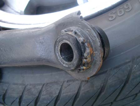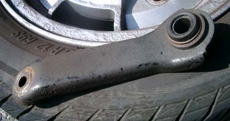 上の画像が応急処置で溶接したブッシュ、溶接時の熱でゴムが変形してしまっている。 しかし不快な音の原因はここだけではなかった。 |
