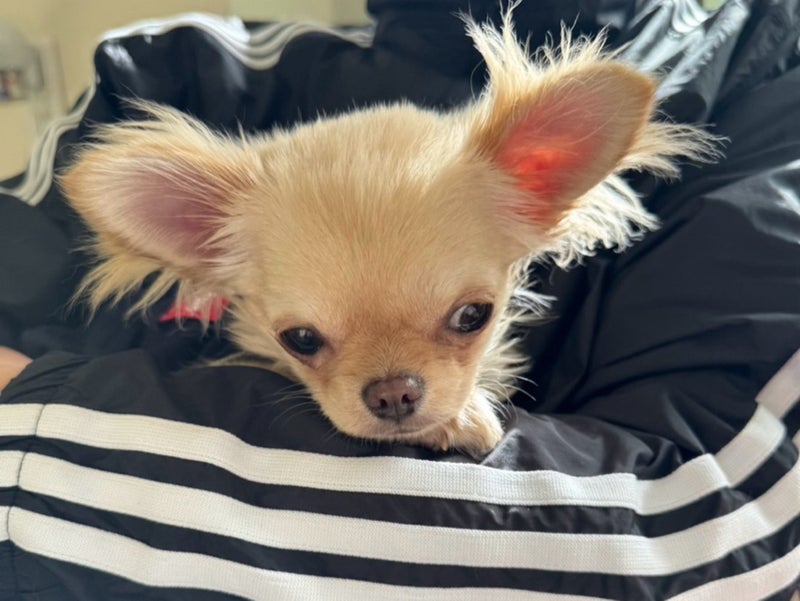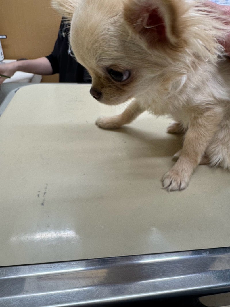 チワワ♀ みこいちゃん 2025.7.20 体重 1.5kg 耳 汚れ少々 べん検査 マイナス フィラリア なし 心雑 なし パテラ 左右G 8種ワクチン済み みこいちゃん 生まれた時から しっぽがないんです