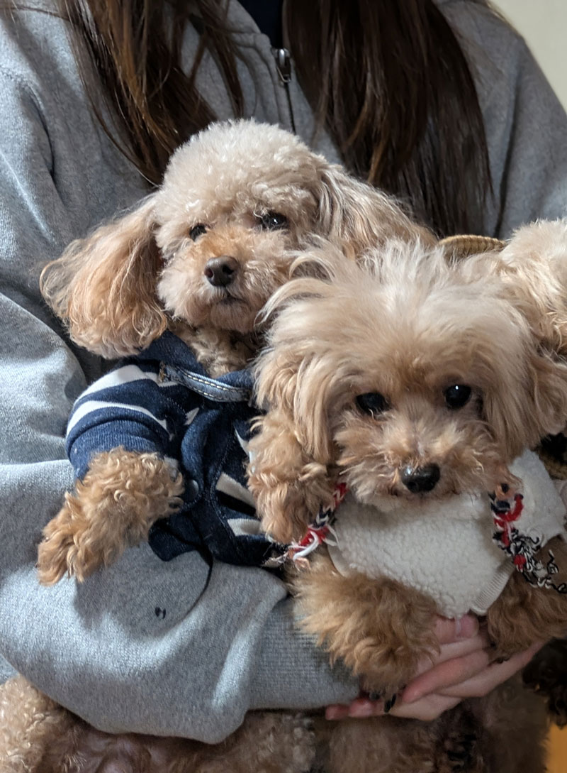 保護犬のあんりちゃん(右)と一緒に抱っこ