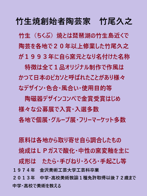 竹生(ちくぶ)焼とは 琵琶湖の竹生島近くで陶芸を各地で20年以上修業した竹尾久之が